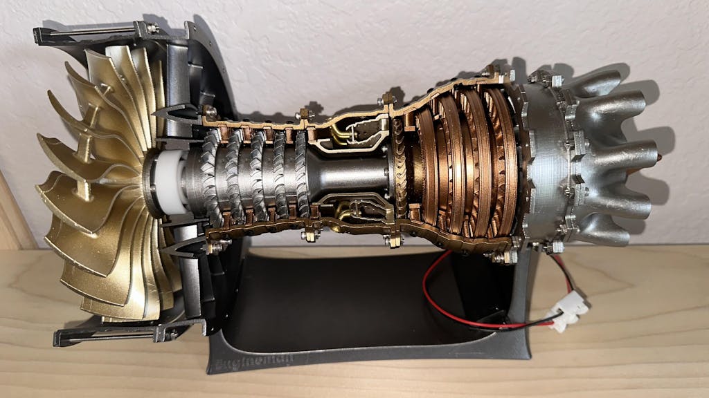 .Drawn from original factory drawings, the transparent turbofan engine model is able to work based on the TR900 engine of the Airbus A380.