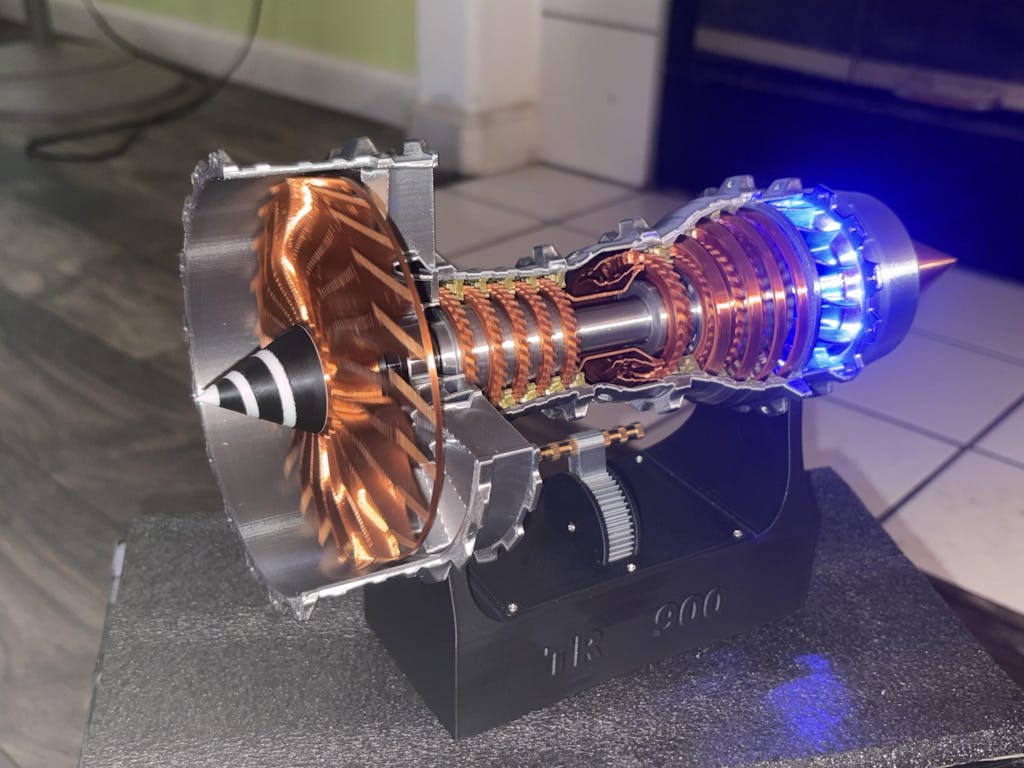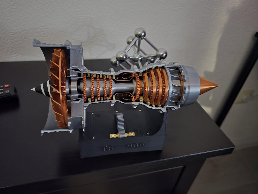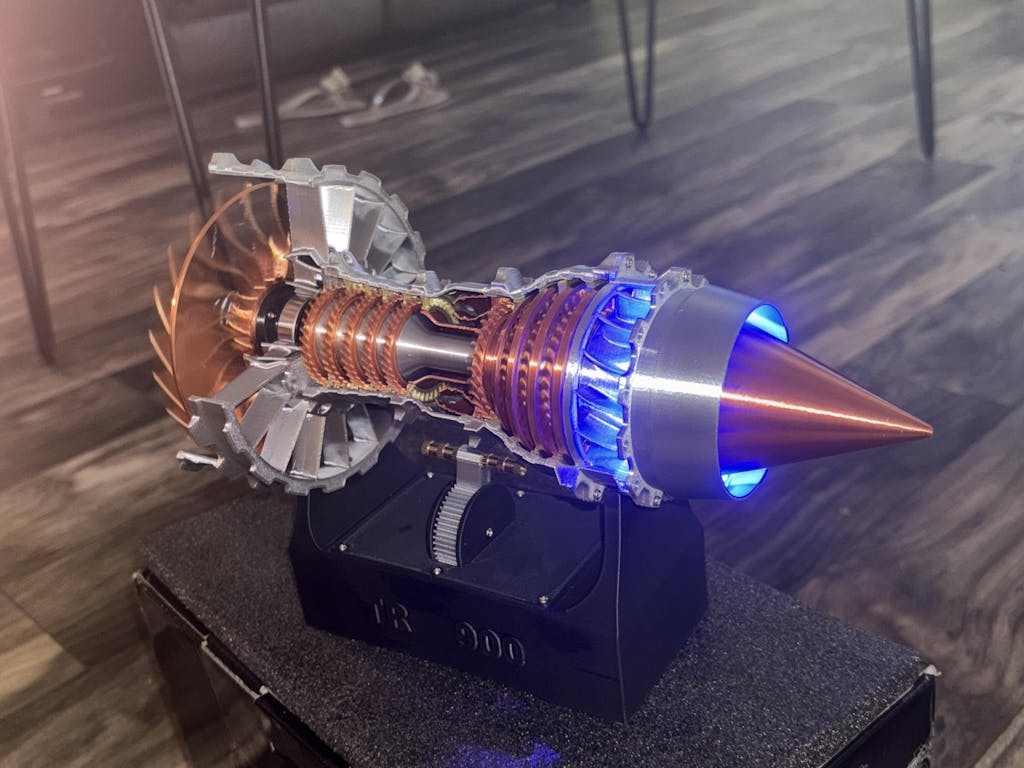 This model is meticulously crafted based on original blueprints of the TR900 engine, a functional, transparent airplane turbo fan engine model. It features simulated lighting and a throttle lever for speed control.