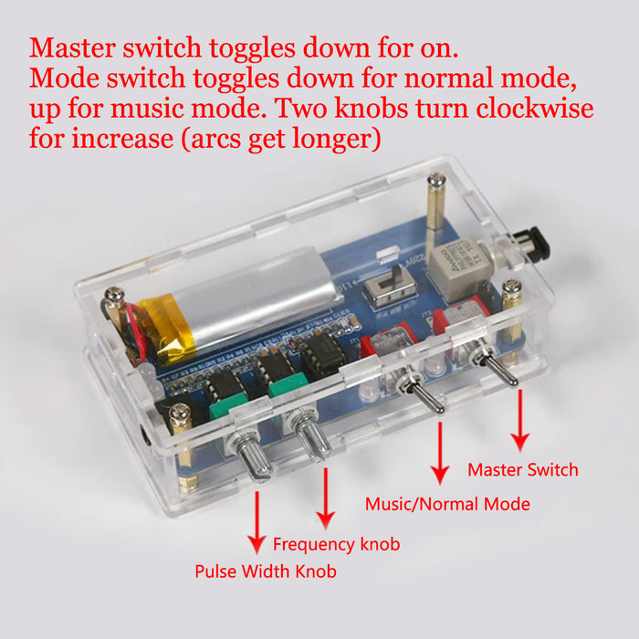 Music mode: find the square wave music, in the case of the controller is powered off using 3.5MM audio cable and the player connected to the playback device, and then open the arc extinguisher switch mode switch can be, play music can try to adjust the playback volume to adjust the pulse width.