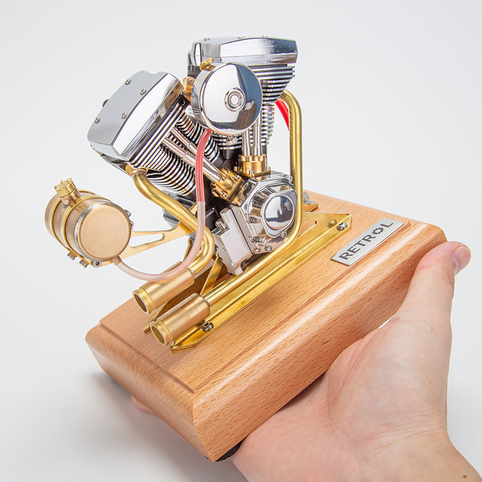 .Color: Brassiness & Sliver .Material: Brass + Stainless Steel .Model Brand: RETROL .Type: V-Twin 2-Cylinder 4-Stroke Gasoline Engine .Item No.: R33 .Overall Dimensions: 15 x 12 x 14cm .Engine Dimensions: 12 x 9 x 11.5cm .Wooden Base Dimensions: 15 x 12 x 3cm .Scale: 1/5 .Product State: Ready to Run .Displacement: 4.2CC .Cylinder Diameter: 13mm .Stroke: 16mm .Cooling Method: Air-cooled .Starting Method: Electric Drill Start/Manual Start .Ignition Method: CDI Electronic Ignition .Spark Plug Type: 3/16-40 inch Threaded Spark Plug .Lubrication Method: Mixed/Splash Lubrication (Gasoline/Oil=25/1) .Fuel: 95# Gasoline .Oil: 2T Oil .Starting Power Battery: 4.5V AA Battery*3 (Not Included) .Product Weight: 1300g .Product Dimensions: 12 x 9 x 11cm .Package Weight: 2100g .Package Dimensions: 20 x 20 x 20cm .Packaging: Gift Box .Ages: 14+