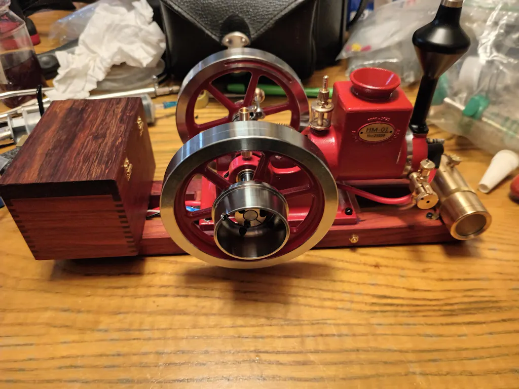 This is my first model engine. It is easy to be critical, that's not my intention. Slightly disappointed, several issues... 1. The high-tension spark plug lead was too short for the sled. I needed to cut and join a section in the middle, under the sled. 2. The auto centering shim on the governor flywheel did not grip the crankshaft. I needed to pack the shim to gain enough pressure to finally grip the shaft. 3. The glass oil cup for the piston leaks at the joint to the block. It needs a seal. I fixed it with thread tape. 4. The crankshaft counterbalance weights were poorly finish. They needed fine filing to remove excess metal from the edge. It is running and a joy to watch. As I say this is my first model engine, maybe these issues are normal...? Trevor.