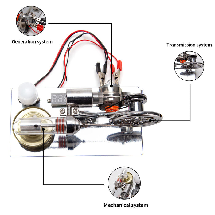 This Stirling engine model features a classic γ-type structure coupled with a small generator. When heated by an alcohol lamp, the engine runs smoothly and generates electricity to light up an LED or bulb. This ingenious design showcases the beauty and functionality of mechanical operation.