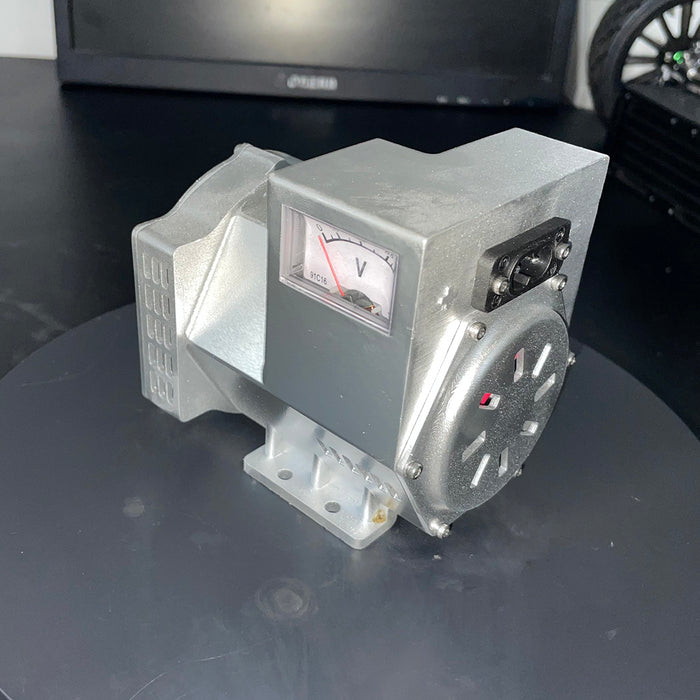 1.This is a small model of a DC generator with a digital voltmeter and a mounting aperture of 52.5 x 20 mm. it is exquisite and beautiful, with a rather simulated design that reproduces the real details. 2. If driven by a steam engine or internal combustion engine, it will reach a maximum output of 60W at 2500 rpm, with a maximum output voltage of 118V, which is the standard for daily electricity use, it is in very good condition and will not disappoint! 3. It can be used as a model to upgrade and modify the engine to achieve the effect of power generation, enriching the play style and giving the engine model more functions, making it more than just a model. It can be used to upgrade the model engine to achieve power generation and to enrich the game. 4. It can also add some flair and ornamentation to your model engine thanks to its beautiful compact appearance. It uses a centrifugal fan to dissipate heat, so it won't overheat even after long periods of use. Give it as a gift to your friends and family and they will love it! 5. Note that we come with two types of drive, one using a pulley to drive the generator, and the other using a coupling to connect the engine to the generator.