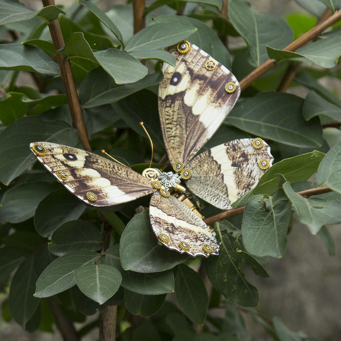 .The model is made of premium-quality metal materials including stainless steel, iron and copper with many carved parts to create a retro steampunk style. Features visible wings texture with a thickness of 3-4mm for wear resistance, restoring the real butterfly wings.